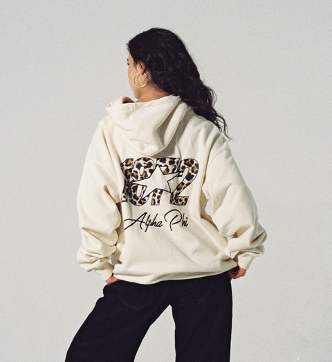 This heavyweight sorority hoodie features a modern drop-shoulder cut and a slightly oversized fit, with no drawstrings for an elevated streetwear vibe. It features a printed design on the front and back.